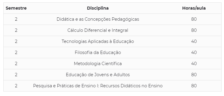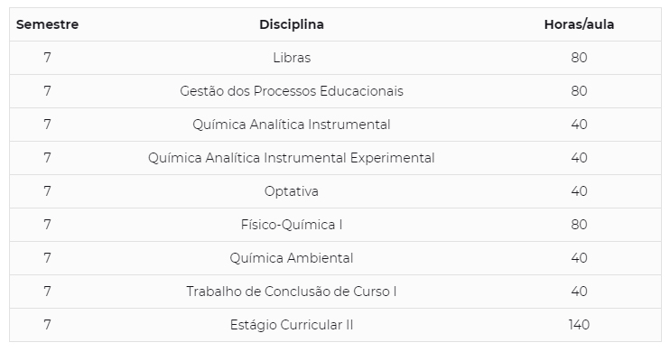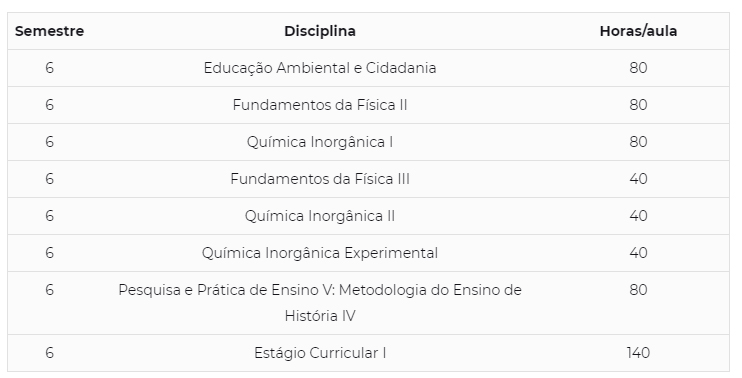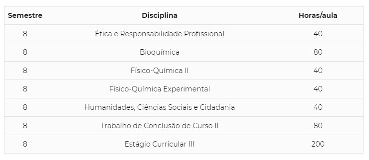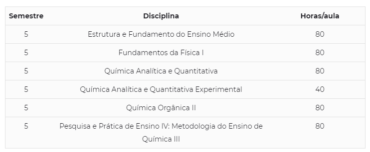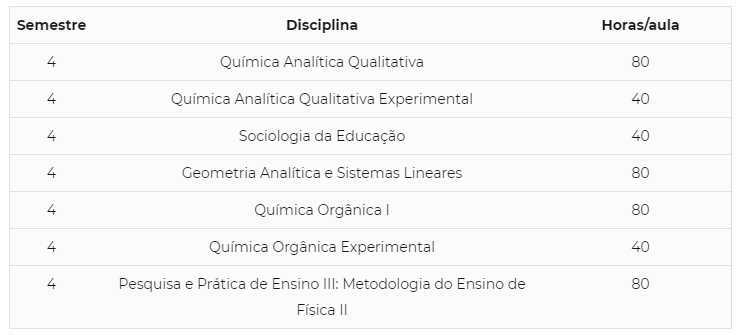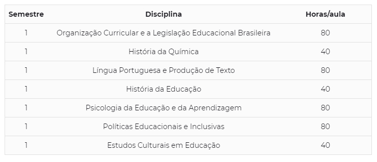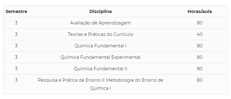 1º Semestre Carga Horária Curso Licenciatura em Química InBETT (Foto: Reprodução/Inbett)